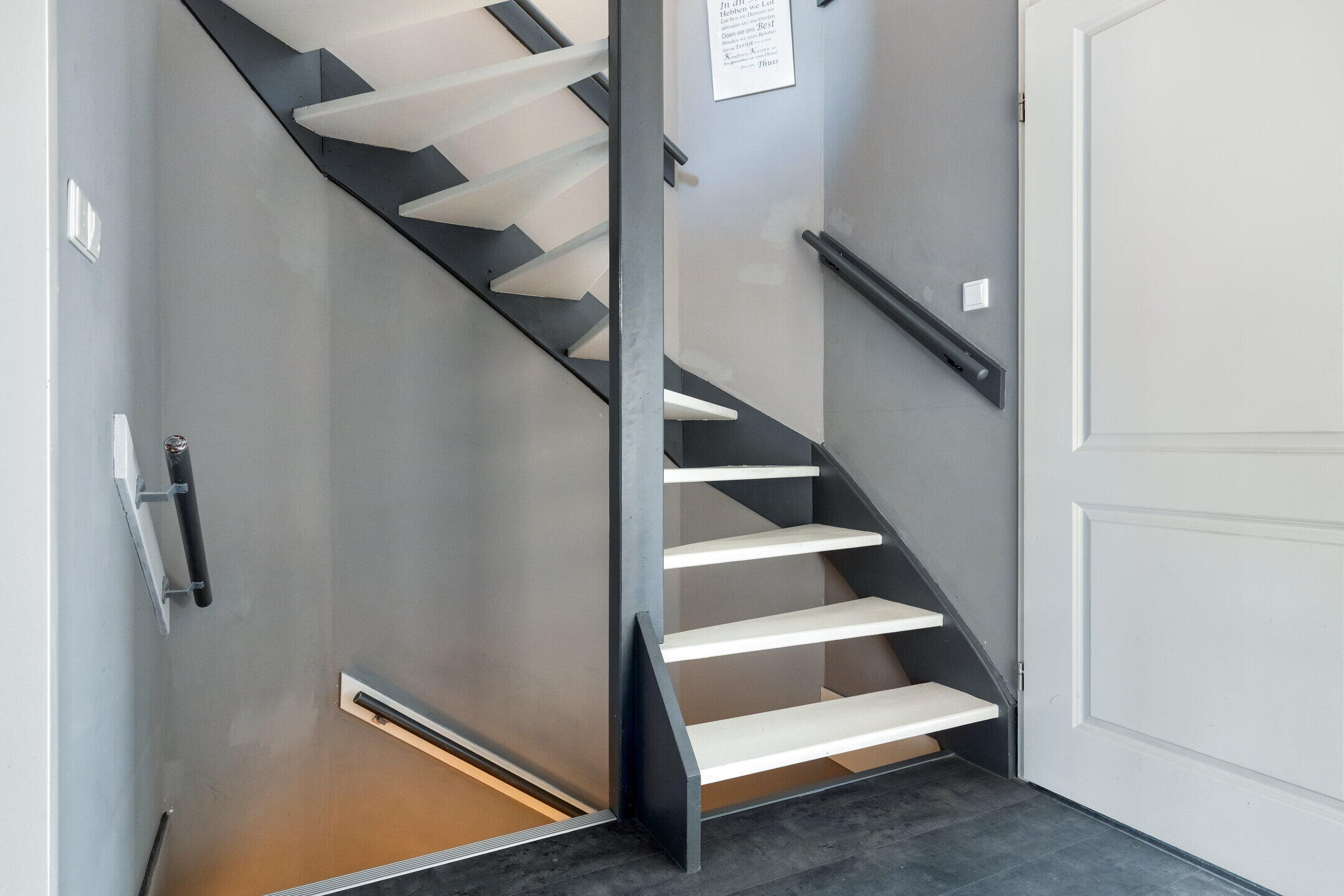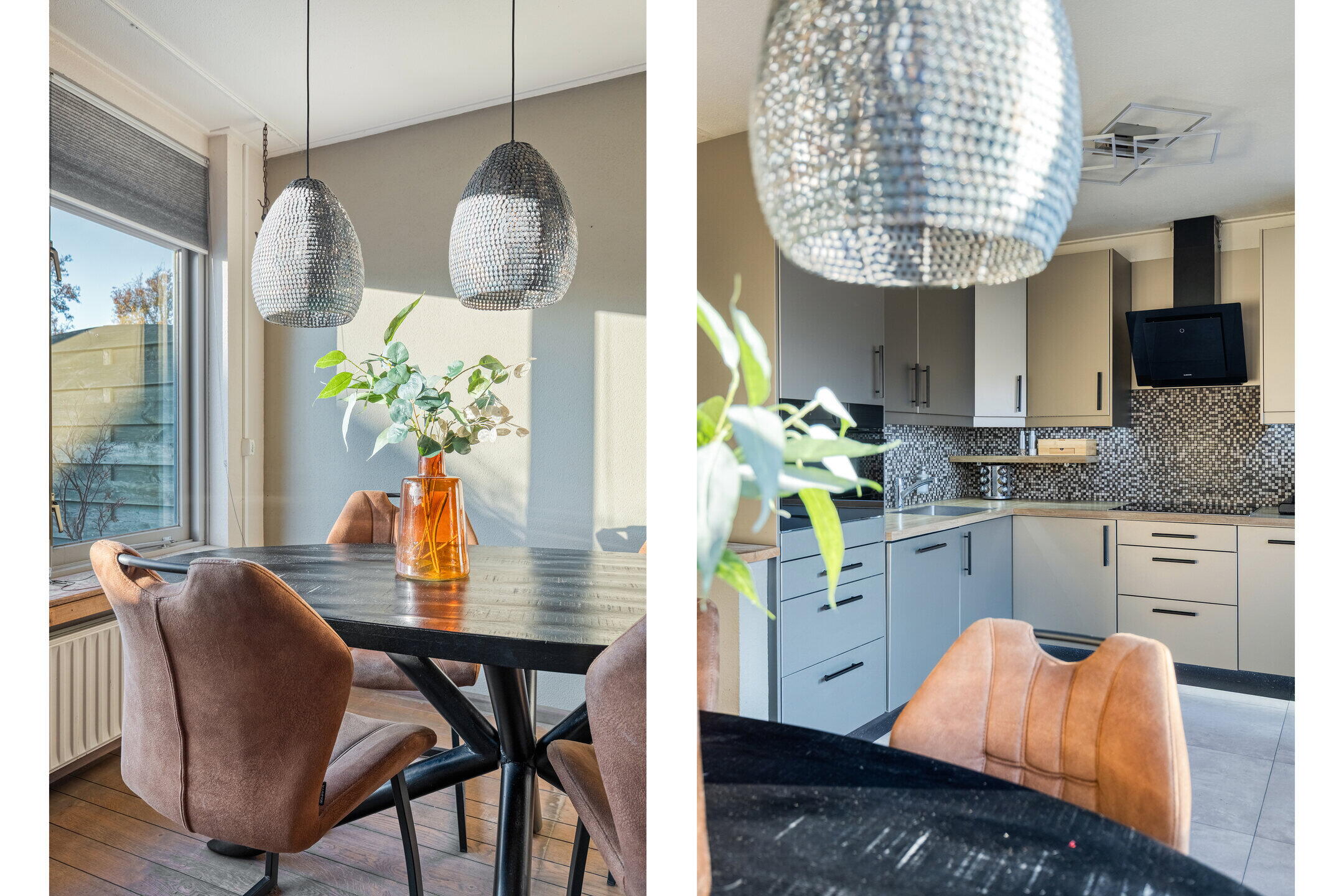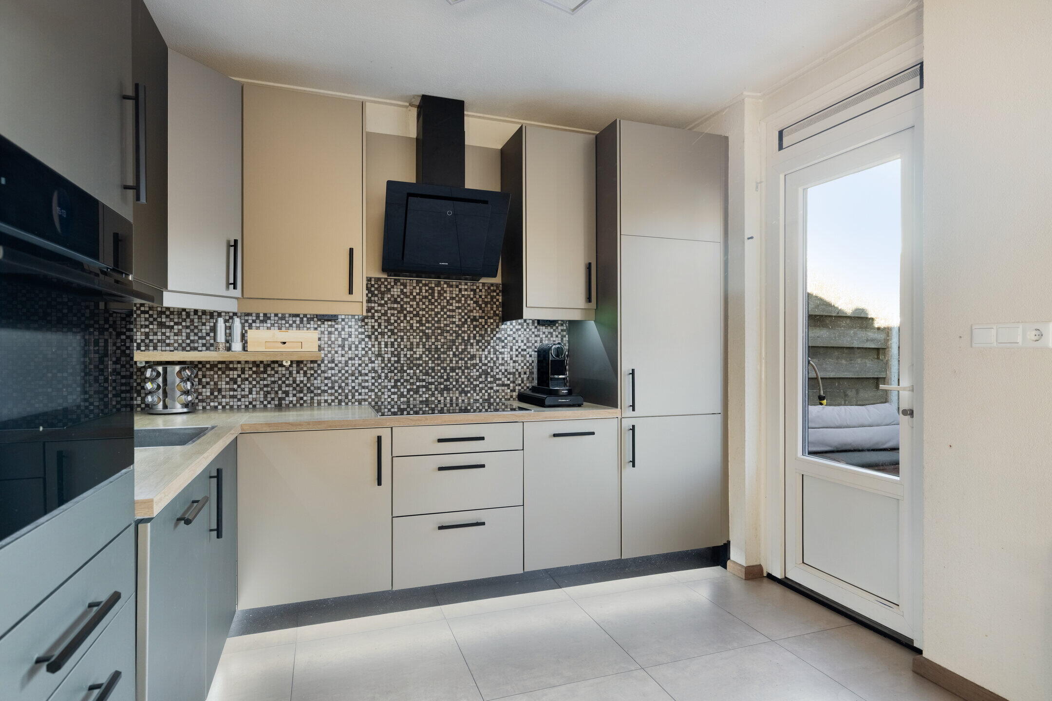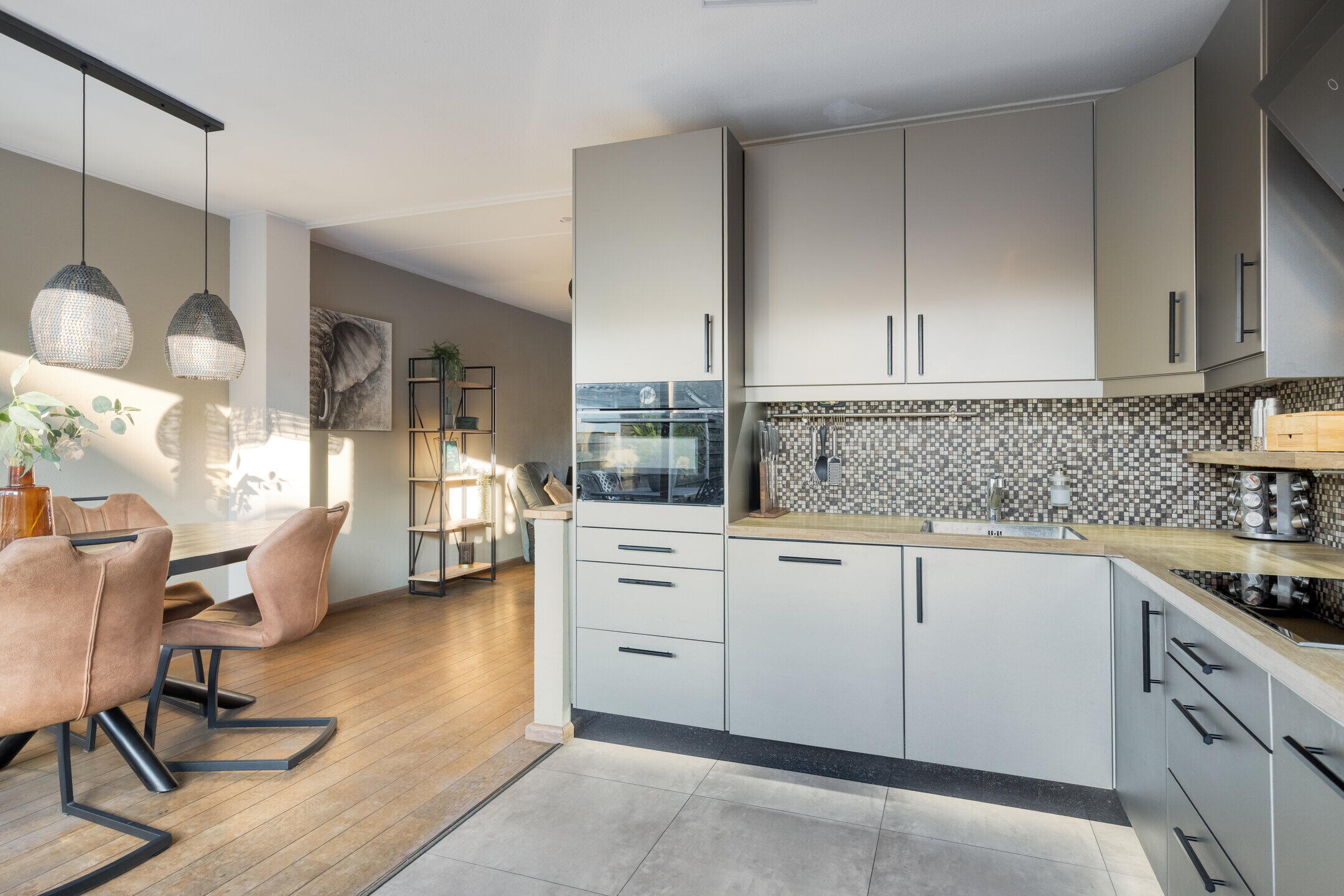 De woonkamer is heerlijk ruim en netjes afgewerkt, met veel natuurlijke lichtinval. Aan de voorzijde is er een fijne zithoek, terwijl de eethoek naadloos aansluit op de open ruimte. In de hoek is een fijne plek gecreëerd die perfect dienst kan doen als thuiswerkplek of speelhoek. De trap is subtiel weggewerkt achter een deur — netjes en praktisch! De keuken is een echte eyecatcher: modern, mat afgewerkt met zwarte details. Uiteraard is deze voorzien van alle gemakken, zoals een inductiekookplaat en inbouwapparatuur. Hier kook je met plezier!