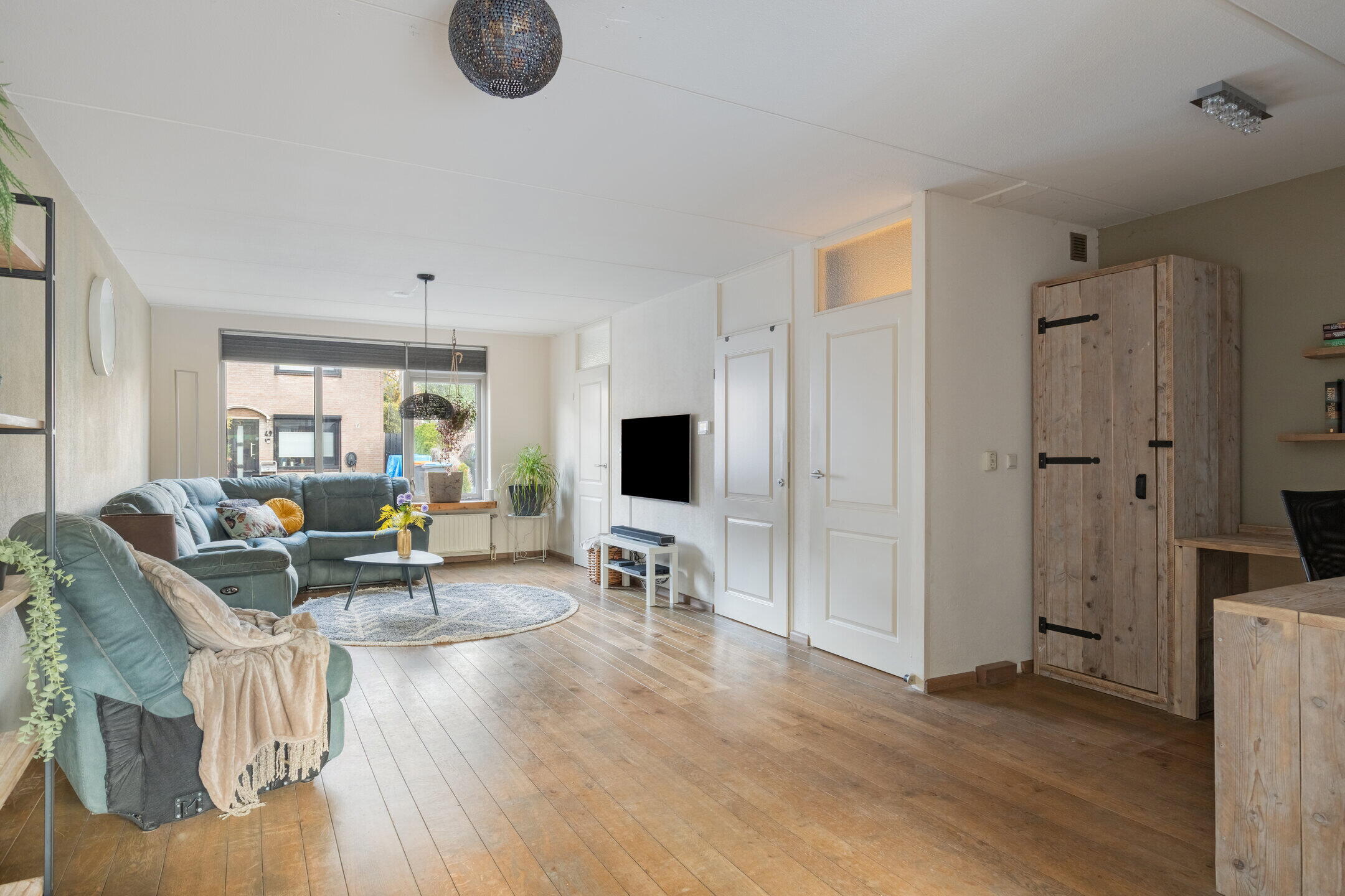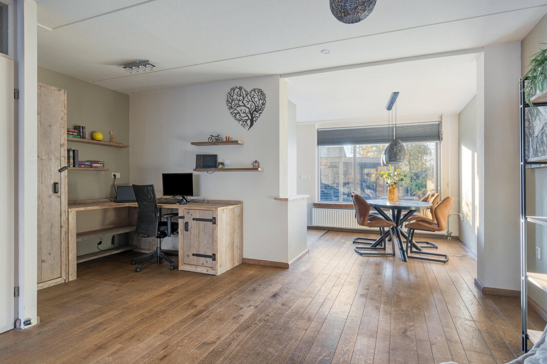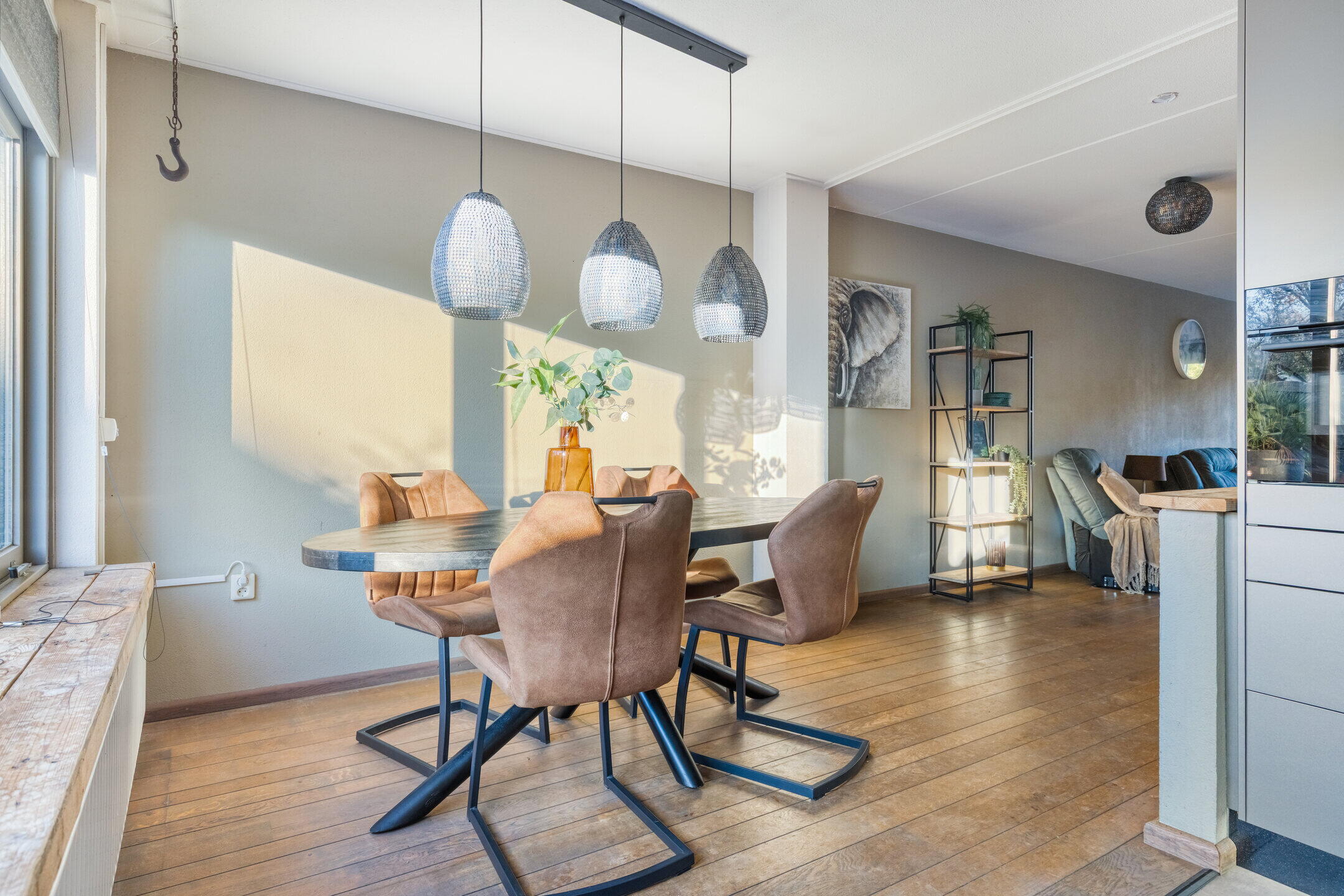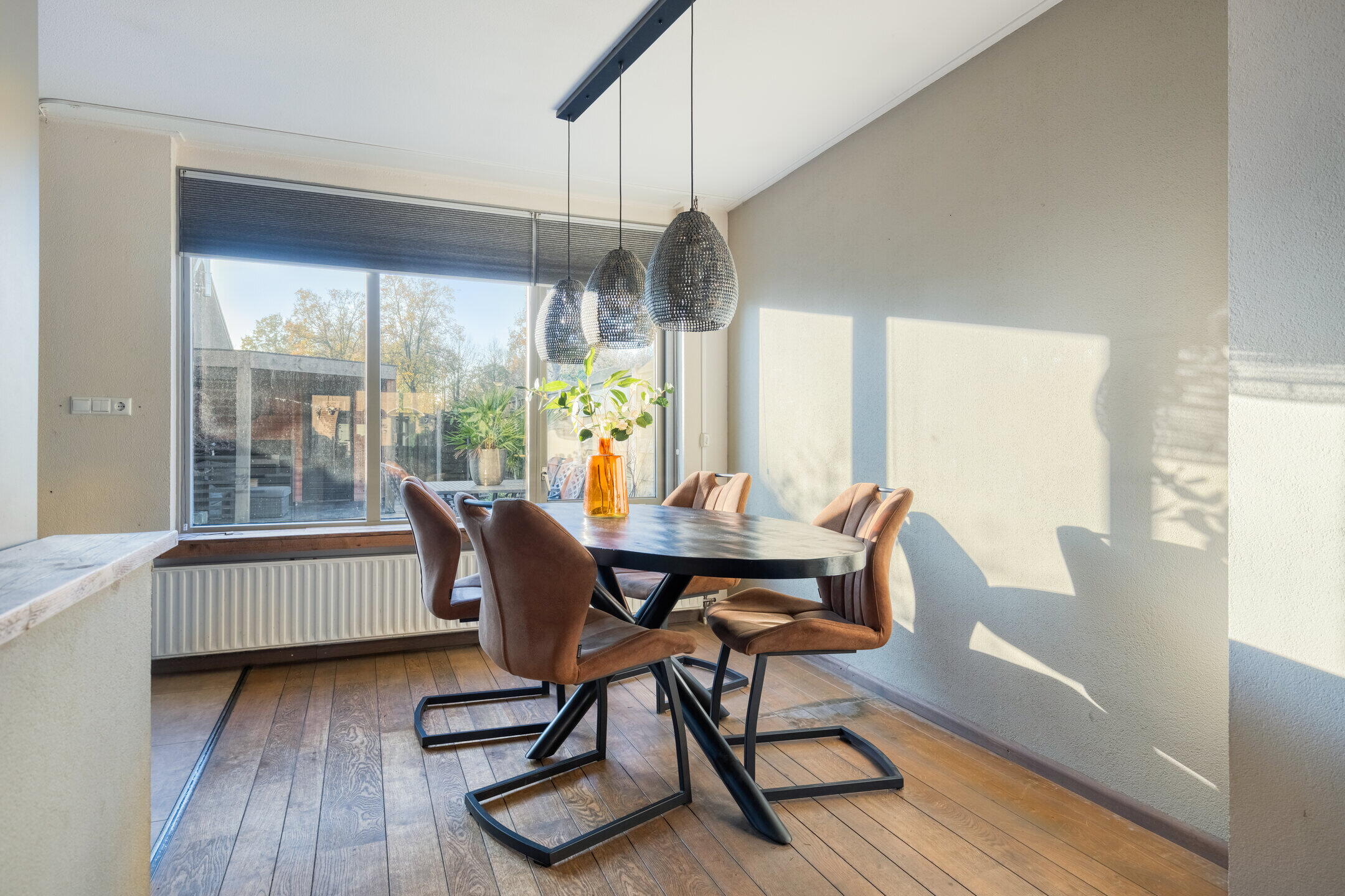 De woonkamer is heerlijk ruim en netjes afgewerkt, met veel natuurlijke lichtinval. Aan de voorzijde is er een fijne zithoek, terwijl de eethoek naadloos aansluit op de open ruimte. In de hoek is een fijne plek gecreëerd die perfect dienst kan doen als thuiswerkplek of speelhoek. De trap is subtiel weggewerkt achter een deur — netjes en praktisch! De keuken is een echte eyecatcher: modern, mat afgewerkt met zwarte details. Uiteraard is deze voorzien van alle gemakken, zoals een inductiekookplaat en inbouwapparatuur. Hier kook je met plezier!