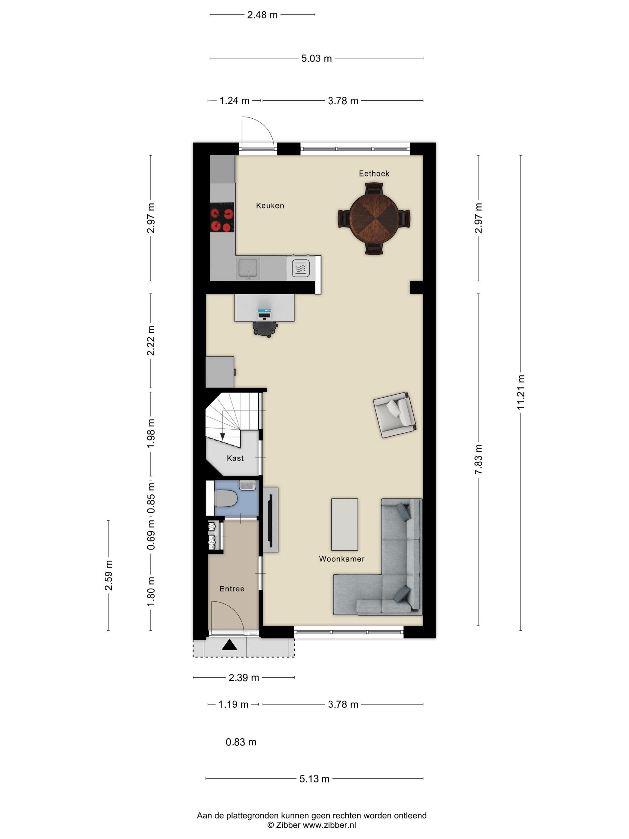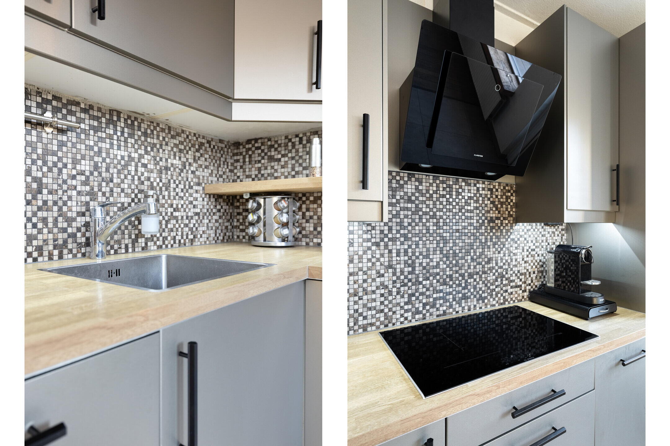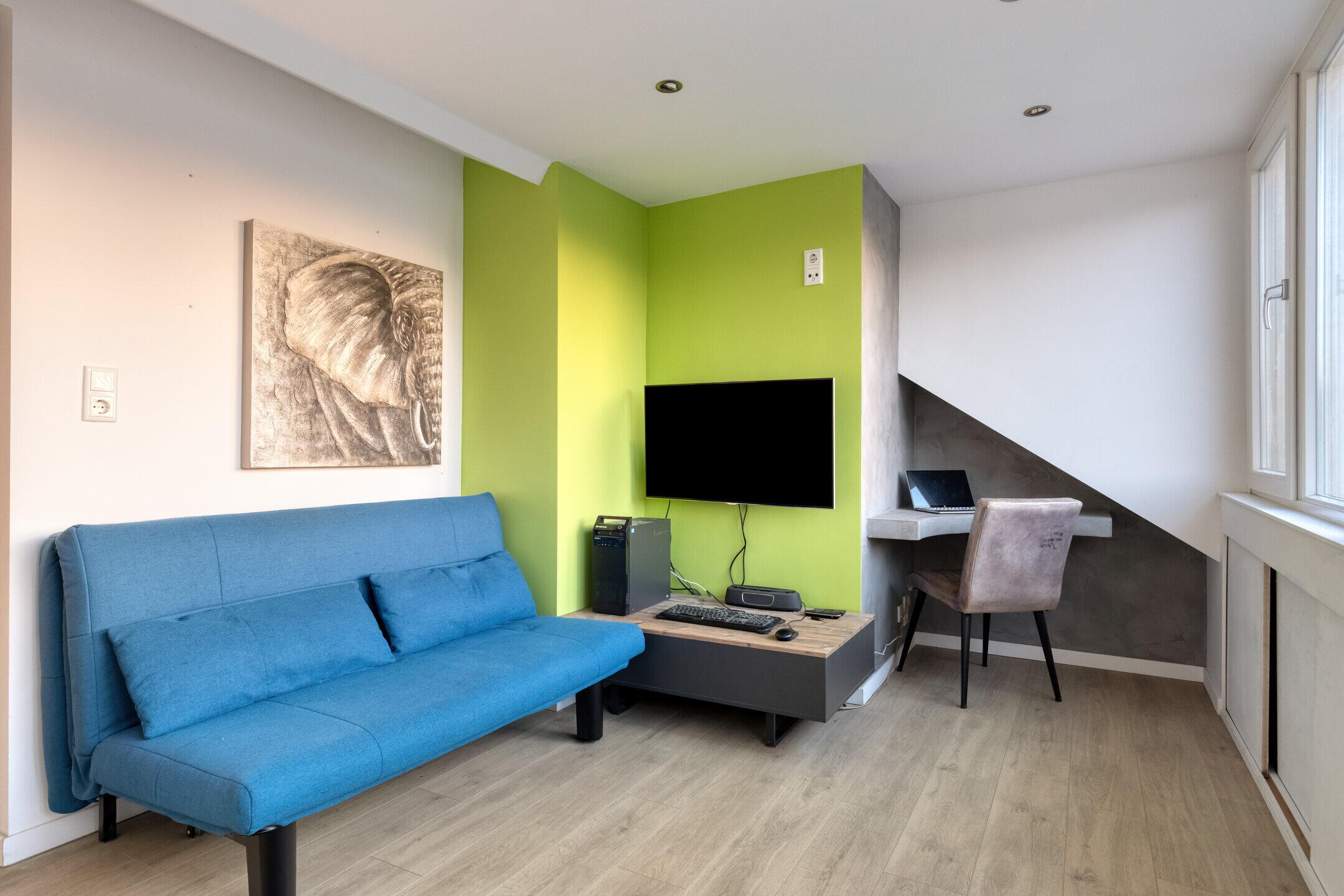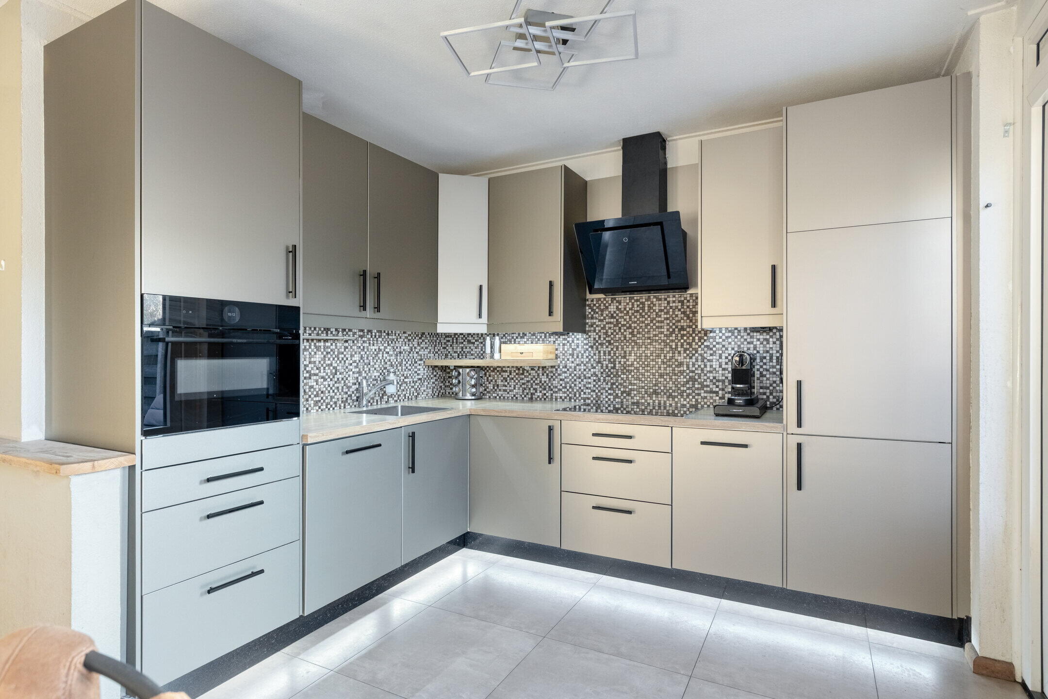 De woonkamer is heerlijk ruim en netjes afgewerkt, met veel natuurlijke lichtinval. Aan de voorzijde is er een fijne zithoek, terwijl de eethoek naadloos aansluit op de open ruimte. In de hoek is een fijne plek gecreëerd die perfect dienst kan doen als thuiswerkplek of speelhoek. De trap is subtiel weggewerkt achter een deur — netjes en praktisch! De keuken is een echte eyecatcher: modern, mat afgewerkt met zwarte details. Uiteraard is deze voorzien van alle gemakken, zoals een inductiekookplaat en inbouwapparatuur. Hier kook je met plezier!
