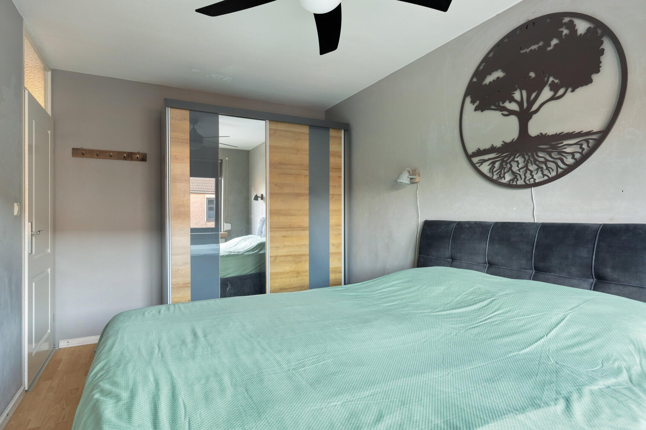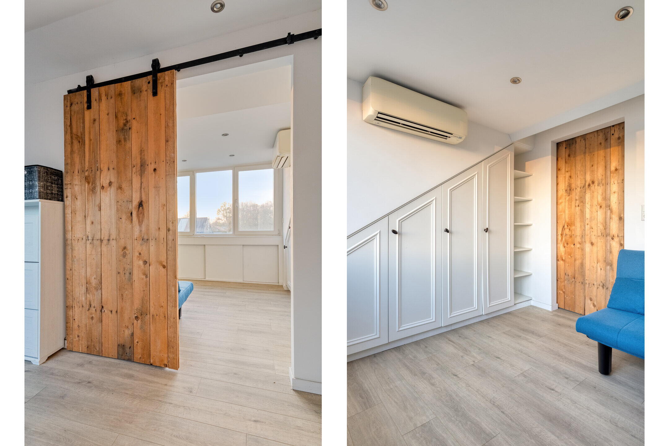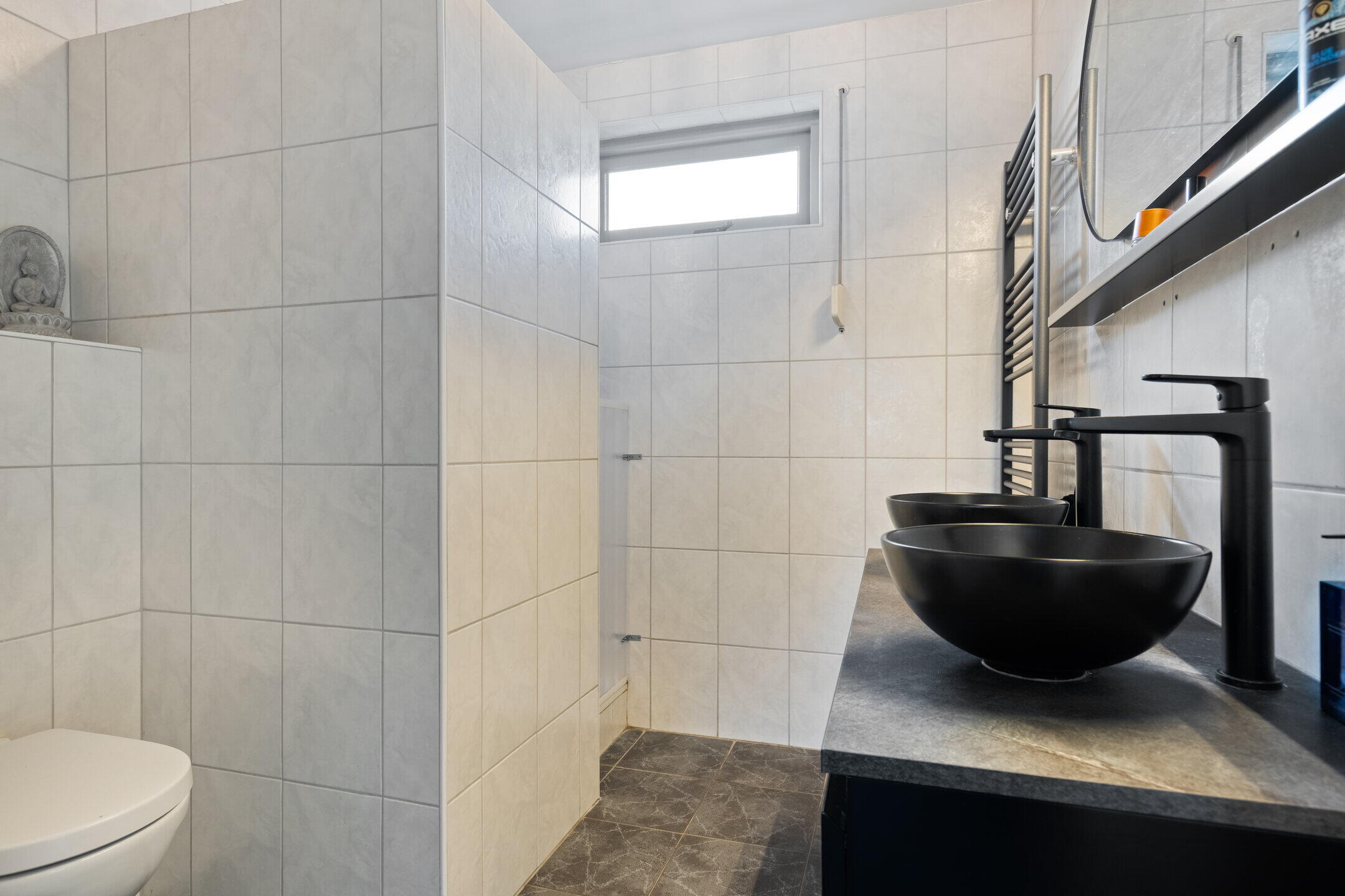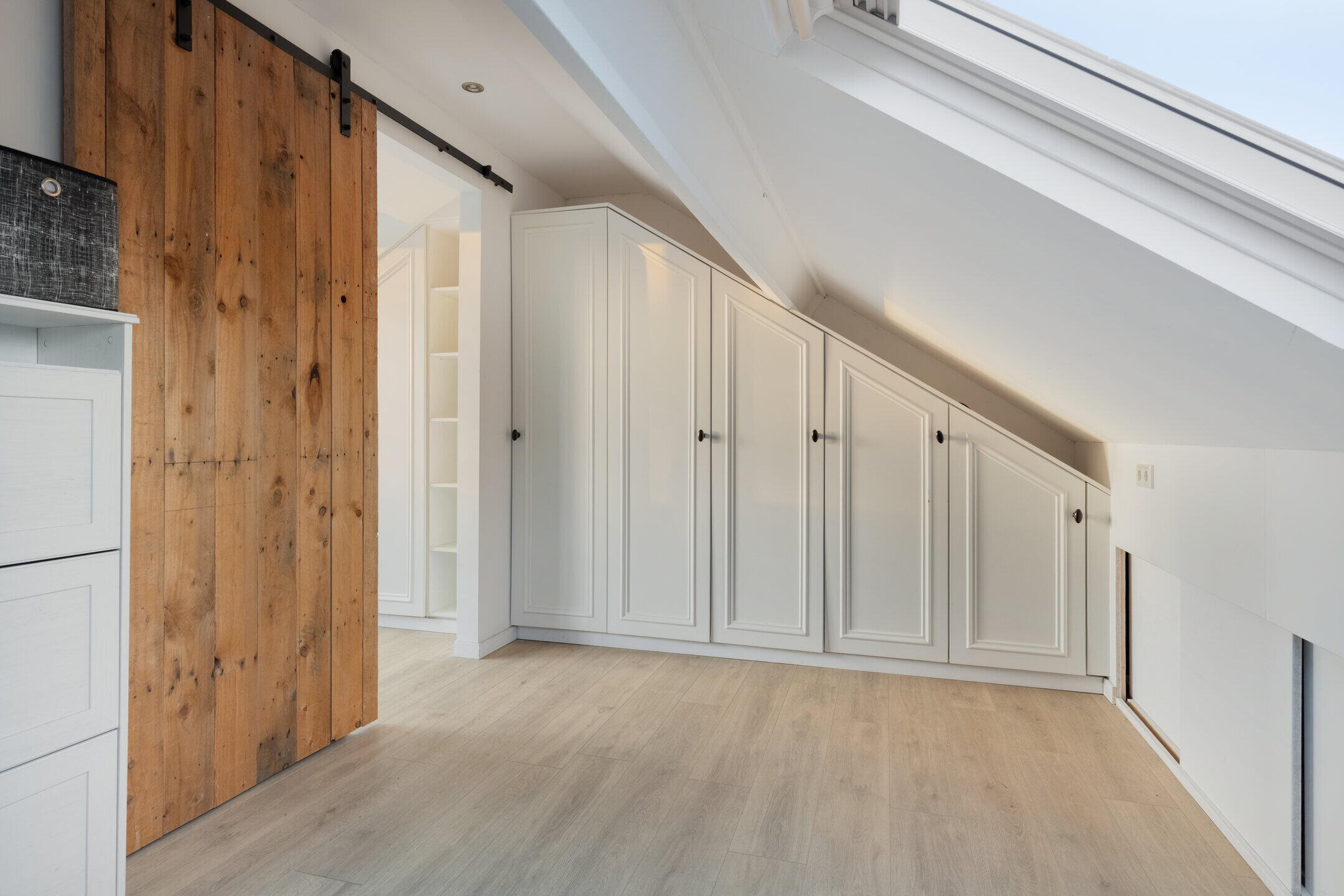 Op de eerste verdieping zijn drie ruime slaapkamers, allemaal met veel lichtinval en een verzorgde afwerking. De badkamer is modern en praktisch ingedeeld, voorzien van een ruime inloopdouche, toilet en een stijlvol wastafelmeubel. De tweede verdieping is een waardevolle toevoeging: strak afgewerkt en voorzien van een vierde slaapkamer met groot dakraam. De overloop is handig ingericht met een houten schuifdeur, waarachter je de wasruimte en extra opbergruimte vindt.