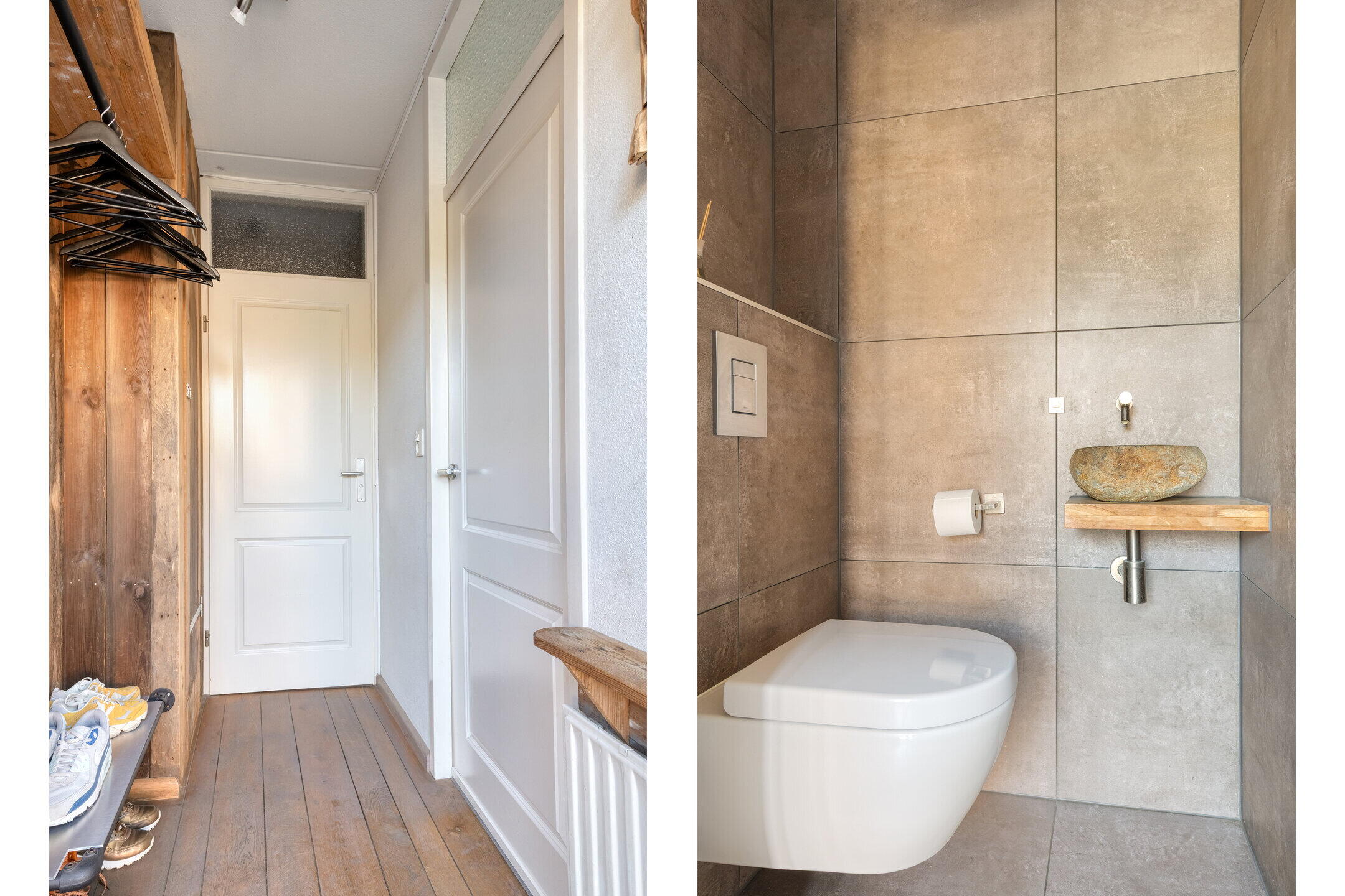 Je betreedt de woning via je eigen oprit, altijd fijn om je auto voor de deur te parkeren. Via de voordeur kom je in de hal, waar zich ook een modern afgewerkt apart toilet bevindt. Een nette, uitnodigende binnenkomst!